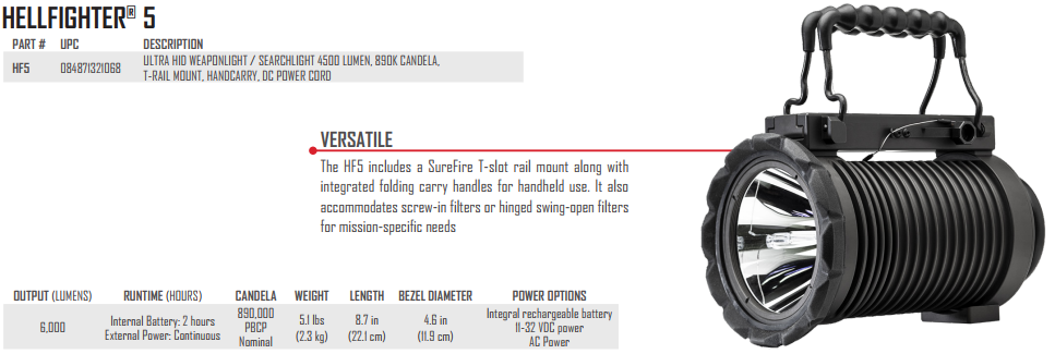 무려(?) 6000루멘이고, HID램프입니다. 핸드헬드를 위한 손잡이가 있지만 중기관총 레일에 달아서 사용하거나 차량에 장착해서 사용하는 제품입니다. 내장배터리로 약 2시간 작동할 수 있다고 되어 있고 카탈로그는 6000루멘인제 홈페이지에서는 4500루멘으로 되어 있긴 하네요. 가격은 $4300 약 590만원 (환율 1,364원/$)
