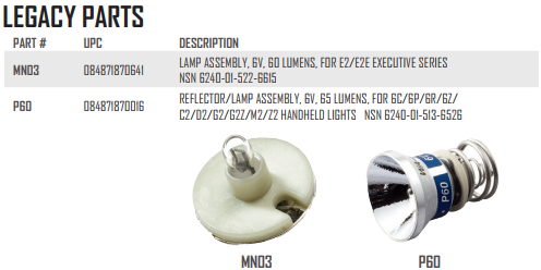 스카우트라이트 제품들 다음에는 각종 악세사리들(리모트 스위치, 베젤류(헤드만 바꿔서 다른 라이트로 사용할 수 있는), 테일캡, 마운트, 라이트 바디(Host)) 소개가 되어 있는 데, 특이하게도 레거시(Legacy) 부품으로 MN03과 P60 제논 램프가 아직도 있습니다. 아직도 사용되고 있는(?) E2e나 6P 모델용으로 나오는 것 같네요. 근데 요즘은 LED는 필수인 데 굳이 수명도 짧고 유지보수비용도 비싼 제논 램프 손전등을 쓰는 건 잘 모르겠네요. 특수한 목적 (전자회로가 없기 때문에??)이나 미국이라서 유지보수비용은 상관없다(!)라고 하는 것인지..